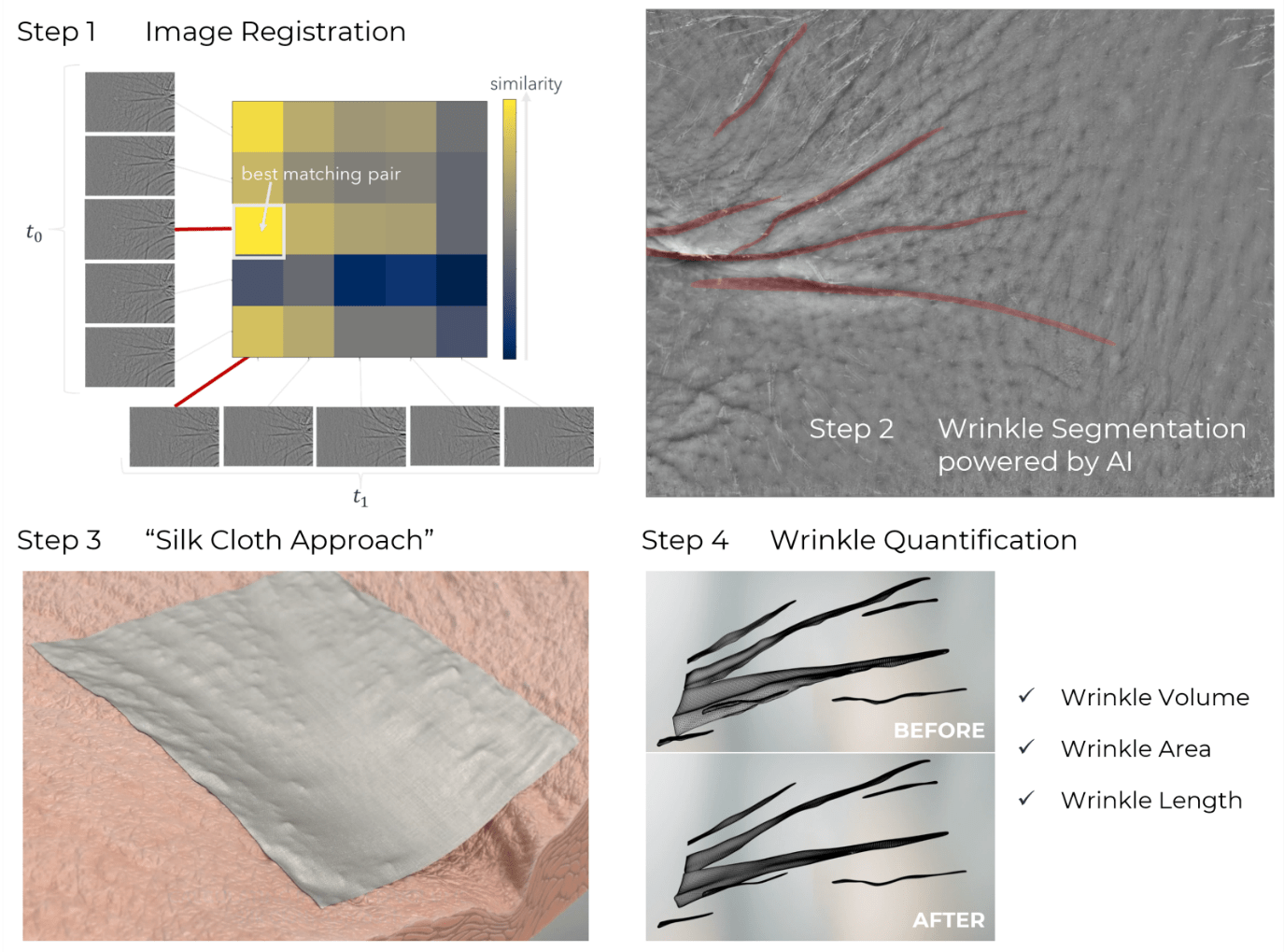 Die Analysepipeline besteht aus mehreren Teilen. Zuerst werden die besten Matches unter den Messwiederholungen pro Messzeitpunkt gefunden, um den Einfluss von Mimikfalten zu reduzieren. Dann segmentiert ein KI-Modell in den PRIMOS-Bildern die Falten. Dieser Schritt ist gefolgt von unserem sogenannten “Silk Cloth Approach”, bei dem in dem Topografie-Bild die exakte 3-dimensionale Lage der Falten approximiert wird. Zuletzt erfolgt eine Quantifizierung der Falten hinsichtlich ihres Areals, ihrer Länge und ihres Volumens.