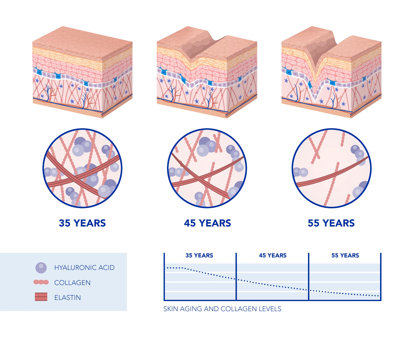 Over time, the skin produces fewer essential substances like hyaluronic acid and collagen. As a result, it becomes thinner, drier, and loses firmness. Wrinkles begin to form, and the skin may appear tired or less radiant.